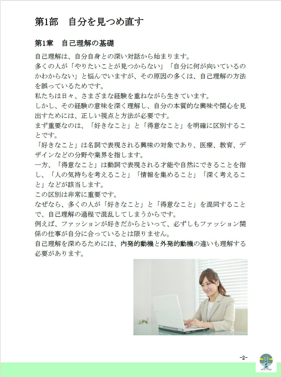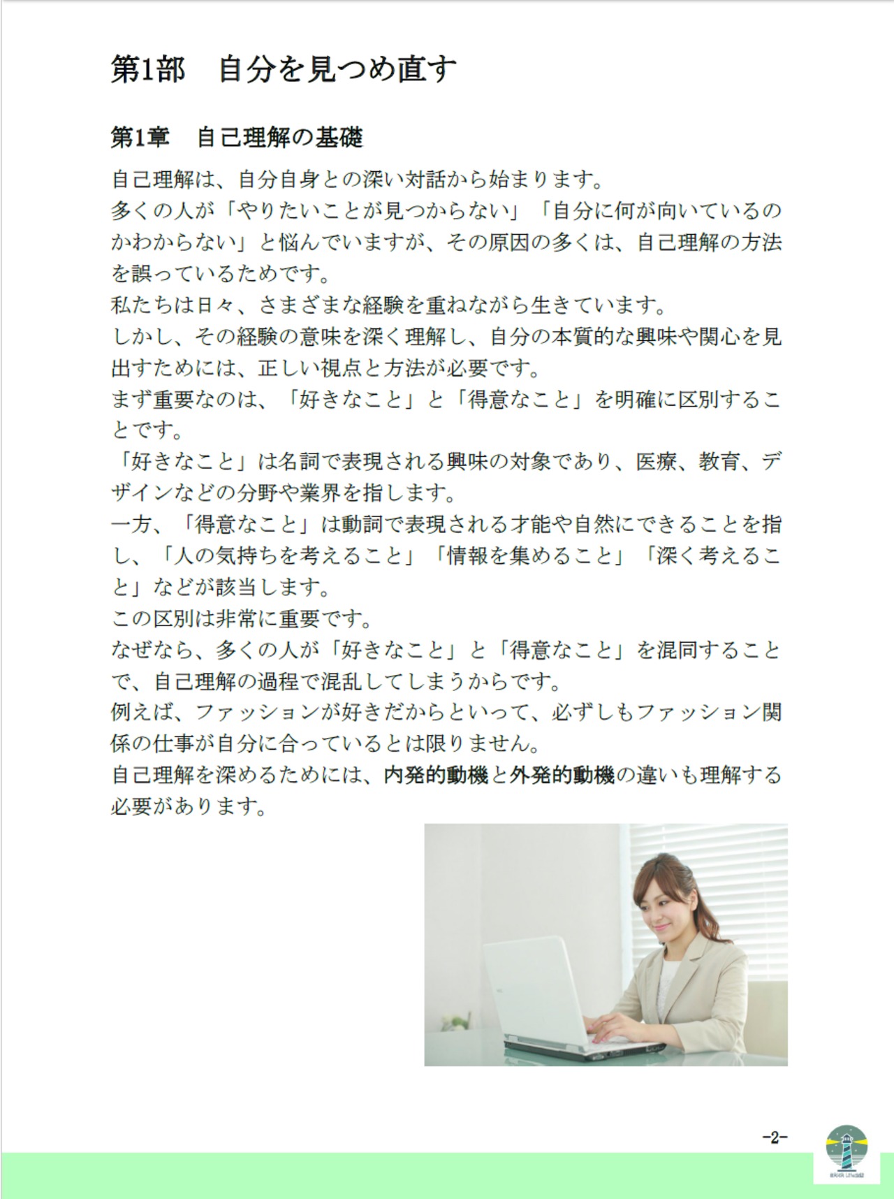 本書では、自己分析やキャリアデザイン、ライフプランニングに役立つ具体的な方法論を紹介しています。人生の各ステージにおける選択肢や、セカンドキャリアを考える際のポイント、さらには心身の健康を保つためのアドバイスなど、多岐にわたる内容が盛り込まれています。読者が自分自身の人生を見つめ直し、より良い未来を描くための手助けをします。